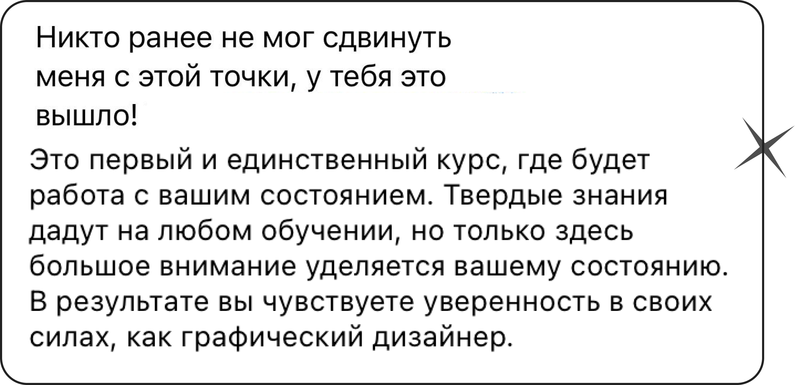 Это первый и единственный курс, где будет работа с вашим состоянием. Твердые знания дадут на любом обучении, но только здесь большое внимание уделяется вашему состоянию. В результате вы чувствуете уверенность в своих силах, как графический дизайнер. Поняла, что графический дизайн моё дело, это по любви.